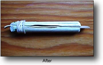 At the end, the rubber band forms a reed suspended along the inner length of the call. Blow into the crack that is now between the two halves. Vary your calls by cupping your hand over the call, stretch or release tension on the rubber band or by pinching the ends of the call.